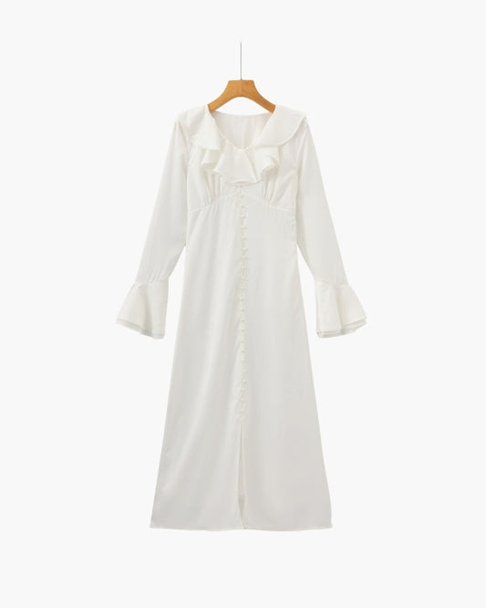 Pearl Button Ruffle Midi Dress